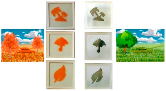 In order to fulfill the demand for military camouflage, patterned electrochromic devices were also tried to be prepared. The pDPTD polymer material exhibited good solubility in chloroform, allowing for the preparation of patterned electrochromic film through spray coating. Here, patterned films such as coconut trees, small umbrellas, and leaves were successfully obtained based on pDPTD polymer material, as shown in Figure 7. Then, these patterned films were further used to achieve the patterned electrochromic devices. They could all transform between yellow and green under the applied potential of −0.4 V and 0.7 V, respectively. When in the yellow-color state, these devices could simulate autumn trees and fallen leaves. While in the green-color state, they could simulate spring trees and growing leaves. Based on this characteristic, such electrochromic devices could be potentially applied in military camouflage areas, and the pDPTD polymer material should serve as the yellow/green system electrochromic camouflage materials.