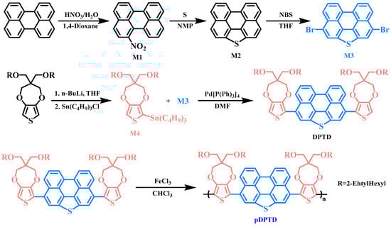 Herein, we reported a soluble conjugated polymer, pDPTD, with yellow-to-green electrochromism based on ProDOT and perylo[1,12-bcd]thiophene, which was synthesized via FeCl3-catalyzed chemical polymerization (Scheme 1). Polymers that contain ProDOT can change from colored to colorless normally. The inclusion of perylo[1,12-bcd]thiophene allows pDPTD polymers to transition from yellow to green for camouflage, together with a large optical contrast and fast switching time. Using pDPTD polymer film as an electrochromic layer, the yellow-to-green electrochromic device was also achieved. The experimental data and analysis will be shown in detail as follows.
