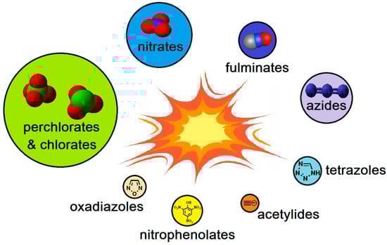 The fascination with fire and explosions appears to be inherent in human nature. Its origins are not fully recognized, but many historians and psychologists agree that it developed over a span from 1 million to about 300,000 years ago, when humans integrated fire as a consistent element of their lives []. In addition to their practical uses in the military, mining, explosive demolition, etc., explosives have been applied in entertainment (primarily as fireworks) and in criminal and/or terrorist activities. These latter three are the most common reasons for preparing explosives in a home setting. Homemade explosives (HMEs) are explosives produced by non-authorized and/or non-professional individuals. HME production significantly impacts the security and stability of many regions. Besides the obvious threats of terrorism and crime, the preparation and use of HME lead to numerous severe injuries among “homegrown producers” and cause serious damage to property and material goods. Despite these clear dangers, combined with the illegality of HME preparation and ongoing legal restrictions, the unauthorized production of explosives has grown rapidly in recent years [].