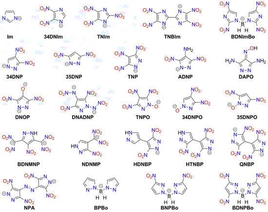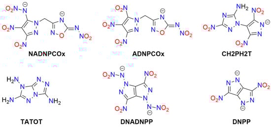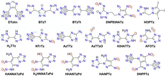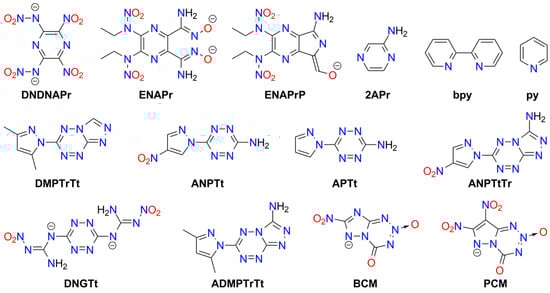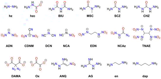 Numerous metal complexes containing the azido ligand or azide anion have been synthesized. Some explosive ammine complexes of Cu and Cr are listed in Table S1. Many other derivatives containing organic amine ligands or ammonium cations do not tend to explode or detonate []. Notable explosive coordination compounds containing azide include complexes of copper(II) azide with triazole or tetrazole ligands [,,] and with imidazole [] (see Table S6). These compounds are more stable than Cu(N3)2 and exhibit promising properties: detonation velocities (DV) of 7.8–8.3 [km s−1], detonation upon heating or mechanical shock, and the ability to initiate conventional materials such as PETN. Wurzenberg et al. also synthesized and characterized several phlegmatized complexes stabilized with dextrin, polysorbate, carboxymethyl cellulose, and polyvinyl butyral []. Joyner et al. reported an interesting series of cobalt ammine complexes containing azide as a counterion or ligand. All of these compounds detonate upon ignition or impact []. Several other acyclic ligands have been studied for the complexation of metal azides: hydrazine (hz; Co(II), Ni(II), Zn(II)) [,,], ethylenediamine (en; Cd) [], and 3-amino-1-nitroguanidine (ANQ; Co(II), Ni(II)) []. Additionally, explosive complexes of mercury(II) azide and cadmium azide have been prepared [,]. Lund et al. reported an interesting example of an azide of Millon’s ion, [Hg2N]N3, which also exhibits explosive properties []. The structures of acyclic ligands and anions used in metal-containing explosives are presented in Figure 2.