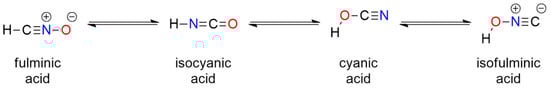 Fulminic acid (HCNO) is a weak, unstable (prone to polymerization), toxic, and gaseous compound. The currently accepted structure is a zwitterionic form, formonitrile N-oxide: H−C≡N+−O− (Figure 3). Its salts, fulminates, exhibit a high degree of covalent bond character between metal and carbon atoms; for example, mercury fulminate is covalent, while thallium fulminate is ionic []. The free acid can be prepared by reacting sodium fulminate with diluted sulfuric acid and isolating it by extraction with diethyl ether or flushing it with a stream of inert gas. Another method involves HI elimination from the oxime of formic acid iodide (HIC=NOH). The free acid readily polymerizes to form oligomers and polymers [,]. Fulminic acid and its salts are highly toxic. The basic properties of the acid and its salts are summarized in Table S2.