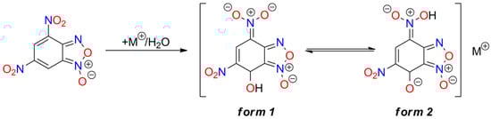 Among the studied furoxans, some metal salts are also recognized as high-energy materials. Generally, these salts exhibit higher sensitivity than the parent furoxans. Also, 4,6-Dinitrobenzofuroxan (DNBF) is the most important and most extensively studied furoxan explosive. It is difficult to initiate by various stimuli (its sensitivity is comparable to RDX and higher than PETN), and, therefore, it is classified as a secondary explosive []. The synthesis of DNBF is straightforward; for example, using 2,4,6-trinitrochlorobenzene as the starting material and NaN3 as a reagent [,]. Numerous salts of this compound have been synthesized, but only the potassium salt is used in ammunition as a primary explosive—a green alternative to lead- or mercury-based primers [,,]. Cation binding by DNBF is possible due to the formation of a Meisenheimer complex with water, alcohol, or amine (Figure 7) [,,]. This reaction occurs in slightly alkaline solutions, such as those containing metal carbonate or bicarbonate. The resulting anion exists in two resonance structures, and the presence of both tautomers has been confirmed in the solid form of DNBF metal adducts.