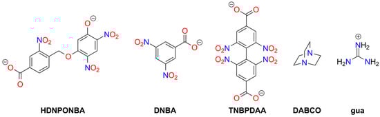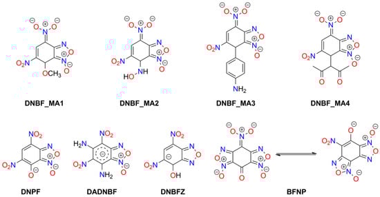 Meisenheimer 4,5-dinitrobenzofuroxan adducts, such as those with methanol (DNBF_MA1) [,,], hydroxylamine (DNBF_MA2) [,], aniline (DNBF_MA3) [,], dimethylaniline [], phenol [], or acetylacetone (DNBF_MA4) [], form salts exhibiting explosive properties (see Figure 8). Available physicochemical data for these compounds are very limited. Thermogravimetric (TG) studies indicate lower thermal stability than DNBF, except for the aniline-derived compound. The hydroxylamine analogue is more easily initiated by impact than KDNBF (2.7 J) [].