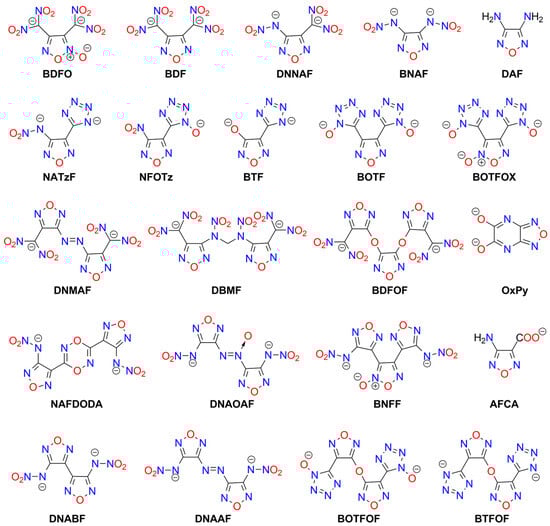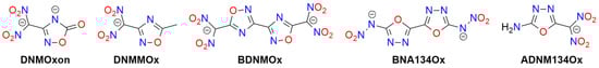 Furoxan (1,2,5-oxadiazole 2-oxide; HOF 226 [kJ mol−1]) derivatives are known explosive compounds, and this moiety can be considered a “hidden” nitro group (Figure 6).
