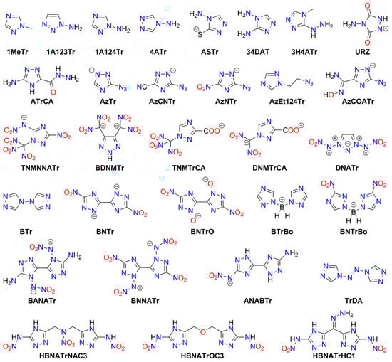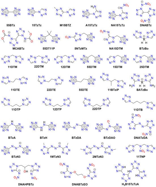 - Abbreviations used:DV—detonation velocity, ESD—electrostatic discharge, FS—friction sensitivity, HOF—the heat of formation, IS—impact sensitivity;ECC—energetic coordination compound, EMOF—energetic MOF, HME—homemade explosive, MOF—metal–organic framework;LA—lead azide, LSt—lead styphnate, MF—mercury fulminate, PETN—pentaerythritol tetranitrate (pentrite), RDX—1,3,5-trinitro-1,3,5-triazinane (hexogen), TNT—2,4,6-trinitrotoluene.Abbreviations for other compounds are provided in figures with compound structures. Please note that numerous compounds may exist in neutral form (HA; e.g., tetrazole: HTz, CHN4) or anions (A−; e.g., tetrazolate: Tz, CN4−).