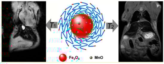 The different methods to prepare DMCAs by embedding MnO (paramagnetic T1 contrast material) into Fe3O4 (superparamagnetic T2 contrast material) have been extensively studied [36,58]. As a recent example, Lu et al. reported hydroxyl−PEG−phosphonic acid-stabilized spherical Fe3O4/MnO (MnO@Fe3O4-OH-PEG-PH) NPs, highly water dispersible due to the hydrophilic surface coating, and with 21 nm hydrodynamic size as obtained by dynamic light scattering (DLS) technique. Their values of r1= 22.8 mM−1 s−1 and r2 =209.6 mM−1 s−1 (vs [Fe + Mn]) measured in in vitro phantoms at 0.5 T, gave an r2/r1 ratio of 9.2. Their efficiency as T1-T2 DMCAs was confirmed by the observed gradual brightening of the T1w MRI images and the gradual darkening of the T2w MRI images (7 T) of the liver of BALB/c mice upon i.v. injection of the NPs [68] (Figure 1).
