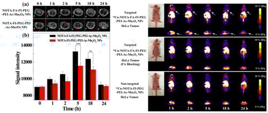 Left: In vivo T1w MR images (a) and signal intensity (b) of HeLa tumors post i.v. administration of the NOTA−FA−FI−PEG−PEI−Ac−Mn3O4 NPs or the NOTA−FI−PEG−PEI−Ac−Mn3O4 NPs (500 mg Mn, in 0.2 mL saline) at different times. Tumors are indicated by white arrows. Mean values were compared via one-way analysis of variance and Student’s t-test and data were marked with (**) for p < 0.01, and (***) for p < 0.001, respectively.; right: micro-PET images of nude mice bearing HeLa xenografted tumors at different times post i.v. injection of the 64Cu−NOTA−FA−FI−PEG−PEI−Ac−Mn3O4 NPs (targeted NPs), the 64Cu−NOTA−FA−FI−PEG−PEI−Ac−Mn3O4 NPs with FA blocking, and the 64Cu−NOTA−FI−PEG−PEI−Ac−Mn3O4 NPs (non-targeted NPs). The whole-body coronal (top) and transverse (bottom) micro-PET images of nude mice bearing HeLa xenografted tumors are presented. Tumors are indicated by arrows. Reproduced with permission from Ref. [101], Copyright (2018) by the American Chemical Society.