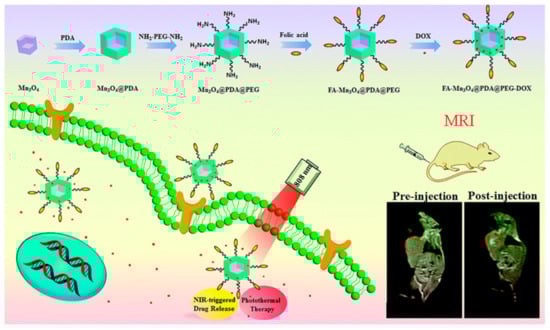 Another nanotheranostic system was designed by Ding and colleagues for MRI-guided combinatorial cancer chemo-/photothermal therapy (PTT). It consisted of Mn3O4 NPs with the surface covered with PDA, which was conjugated to drug (DOX)-loaded PEG-FA. The (FA(DOX)-Mn3O4@PDA@PEG) nanoplatform was characterized by TEM, XRD, FTIR, XPS and HAADF-STEM. The NPs showed excellent colloidal stability in water and strong NIR absorption due to the oxidation and self-polymerization of dopamine to PDA. After exposure to an 808 nm NIR laser, it displayed effective photothermal heating of the solution, adequate for PTT. It could also efficiently load the chemotherapeutic DOX drug, which was taken up by MCF-7 cells, as shown by confocal microscopy, and showed no cytotoxicity. Therefore, the PDA can provide biocompatibility to the NPs and could act as an agent for PTT photothermal conversion and an anti-cancer drug carrier. The NPs, with a high r1 = 14.47 mM−1 s−1, were an excellent MRI CA in vitro. These properties were confirmed in vivo. T1w MRI (3 T) images of tumor-bearing Balb/c mice showed brightening of the whole tumor area 36 h after i.v. injection of the NPs, demonstrating accumulation of a large amount of the NPs in the tumor through the active targeting capacity of the FA vector as well as the enhanced permeability and retention (EPR) effect occurring in the tumor vessels. The combined chemo-/PTT therapeutic effects of the NPs were verified by the effective in vivo tumor inhibition in H22 tumor-bearing mice under 808 nm NIR irradiation, which triggered the DOX drug release. Thus, the system was quite effective for cancer treatment based on MRI-guided synergetic chemo-/PTT (Figure 4) [108].