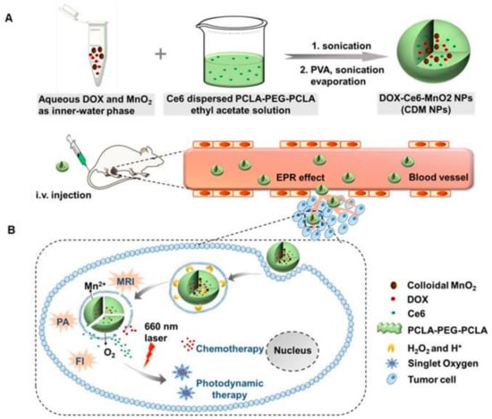 - Hu, D.; Chen, L.; Qu, Y.; Peng, J.; Chu, B.Y.; Shi, K.; Hao, Y.; Zhong, L.; Wang, M.Y.; Qian, Z.Y. Oxygen-generating Hybrid Polymeric Nanoparticles with Encapsulated Doxorubicin and Chlorin e6 for Trimodal Imaging-Guided Combined Chemo-Photodynamic Therapy. Theranostics 2018, 8, 1558–1574. [Google Scholar] [CrossRef] [PubMed]