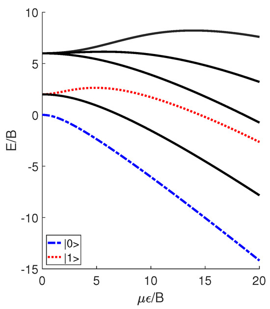 where B denotes the molecular rotational constant, J denotes the angular momentum operator, and denotes the angle between the molecular permanent dipole moment and the electric field . The introduction of the external electric field leads to the generation of pendular states, which are actually the superposition of molecular rotational modes. In Figure 1, we plot the unitless energy levels of the pendular states versus the unitless parameter , where E denotes the eigenenergies of the Hamiltonian H. Note that, in this study, all of the results are presented using the unitless reduced variables, ensuring that the conclusions obtained are applicable to various polar diatomic molecules rather than just a specific one. DeMille [24] utilized the two lowest pendular states with to define qubits and , which can be expressed as linear combinations of spherical harmonics and symbolized by