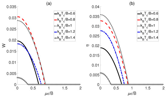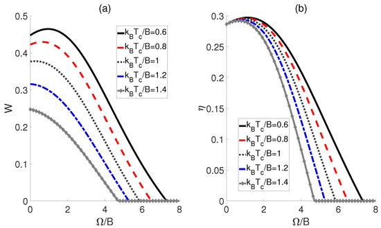 First, the influences of the external electric field and the temperatures of the cold bath on the performance of a QOHE based on polar molecules are explored. Here, we consider the scenario in which the dipole−dipole coupling strength experiences a transformation of , while the external electric fields corresponding to the cold and hot baths remain identical (i.e., ). As shown in Figure 2, both the output work W and the efficiency exhibit similar behaviors with respect to for different temperatures . Concretely speaking, in Figure 2a, we can see that the output work W for each initiates at a non−zero value, and then decreases monotonically to zero as increases. This means that within a limited electric field strength, the QOHE can work normally. However, beyond this range, the positive work cannot be output. Furthermore, we observe that the maximum work output of QOHE is achieved at when is relatively weak. Moreover, the evolution behaviors of the heat engine efficiency are plotted in Figure 2b. For a given , it can be found that the maximum value of occurs at . However, is not the minimum value among the several given but rather a middle value, indicating that the excessive temperature differences between the cold and heat baths might reduce the output efficiency of the QOHE based on the polar molecules.