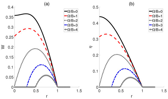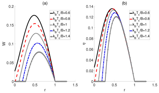 Impact of the ratio r on the work output W (a) and efficiency (b) of the QOHE. Here, , , and .