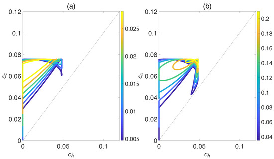 Then, we investigate the scenario where the external electric field varies as the working substance comes into contact with the cold and hot baths, i.e., , while maintaining identical dipole−dipole interactions, i.e., . In this setup, the impact of cold bath temperatures on the performance of QOHE is also considered. For , 0.8 and 1, Figure 3a demonstrates that the work output W initially increases and reaches a peak as is elevated, but then declines with further increases in . This implies the existence of an optimal coupling strength at which the maximum work output can be attained. However, it should be noted that when the temperature is high, e.g., and 1.4, W will decrease monotonously with the increase in . Figure 3b indicates that as increases, the efficiency for all exhibits a single−peak trajectory. Thus, the maximum efficiency of the QOHE can be obtained by precisely controlling . Furthermore, from Figure 3, we can observe that both the output work and efficiency for a given always increase as the temperature difference expands, which contrasts with the case shown in Figure 2.