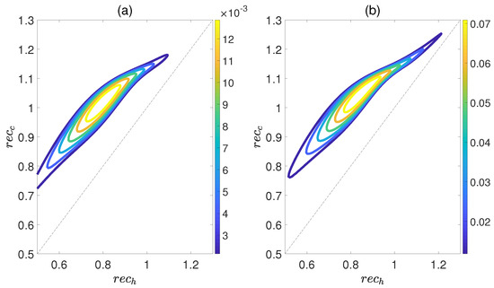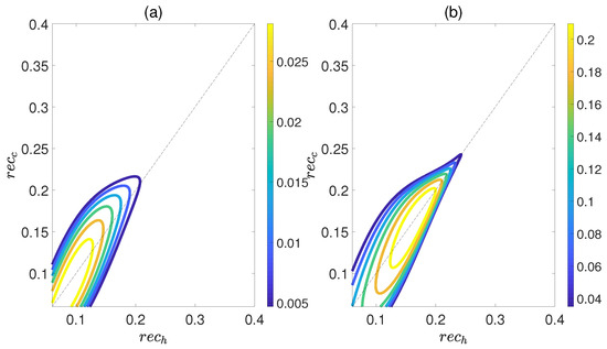Figure 6 demonstrates the dependence of the work output W and the efficiency on the concurrence and , where and denote the entanglement for the state of the working substance reaching thermal equilibrium with the high− and low−temperature baths, respectively. Here, we introduce a relative coupling strength k, defined as the ratio between the dipole−dipole coupling strength and the coupling strength between dipole moment and electric field , i.e., . In Figure 6, k is set to 0.5. We can observe that both W and exhibit non−monotonic behaviors with respect to , while keeping fixed. This highlights an optimal entanglement range that enables the heat engine to work most efficiently. In addition, the density of contour lines varies within different ranges of and . The denser the contour lines are, the more sensitive W and become to entanglement, and vice versa. Furthermore, we also consider the case of , as shown in Figure 7. The trends of W and exhibit similarities to those depicted in Figure 6, except that their order of magnitude is smaller and the non−monotonicities versus and become more apparent. Moreover, regardless of whether k is 0.5 or 1.5, the QOHE can only generate net work within the range of . If , then . Consequently, it can be inferred that the entanglement of polar molecules in thermal states significantly influences the performance of QOHE.