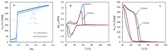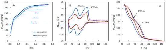 The isotherms of water adsorption and desorption as well as the QE-TPDA profiles of water obtained for CAU-10 are shown in Figure 1. Partially overlapping thermodesorption profiles recorded at different heating and cooling rates are characteristic of sorption-induced phase transitions. A similar behavior was previously observed in the case of a CN-bridged Ni-W coordination polymer, exhibiting a single-crystal-to-single-crystal phase transition [], triggered at 20 °C by water vapor at p/ps = 0.3. The step at p/ps = 0.15, dominating the water sorption isotherms observed for CAU-10, was attributed earlier [] to a transition between the centrosymmetric phase (dry) and the non-centrosymmetric phase (hydrated), differing in the conformations of the AlO6 groups and isophtalate linkers. The desorption patterns presented in Figure 1A,B also indicate high reversibility of adsorption and desorption, with no noticeable hysteresis. This is easy to notice in the case of the isotherms, as they overlap in the step region. For the QE-TPDA profiles, the reversibility of the desorption and adsorption related to the phase transition is indicated by the fact that the overlapping parts of the maxima and minima of the QE-TPDA profiles seem to follow one smooth line.
