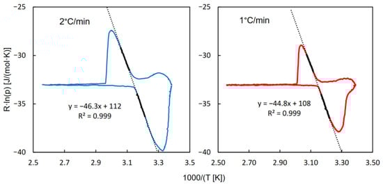 A more convincing graphical representation of this observation is shown in Figure 2, which contains the QE-TPDA profiles transformed according to the van’t Hoff equation. For a reversible phase transition, in which water vapor is the only gaseous reactant, its partial pressure may be treated as an equilibrium constant (Kdes) that obeys the van’t Hoff equation: