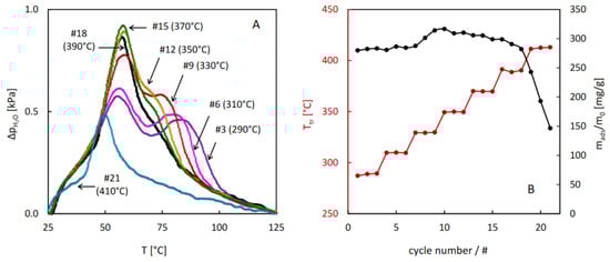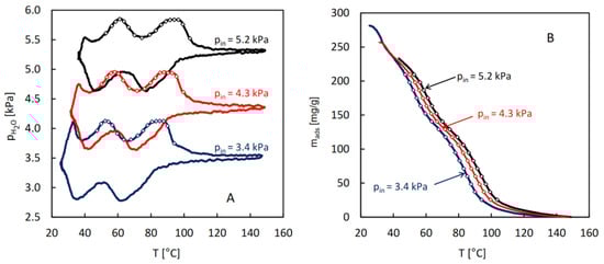 The QE-TPDA profiles (A) of water observed in the new experimental system for MIL-96 at a heating/cooling rate of 2 °C/min at different inlet partial pressures, and the corresponding integral desorption curves (B). The points indicate data found for the preset adsorbed amount values (from 25.5 to 209.5 mg/g, with 11.5 mg/g interval). Experimental details: sample mass m = 5.5 mg, carrier gas (N2) flowrate F = 8.0 cm3/min.
