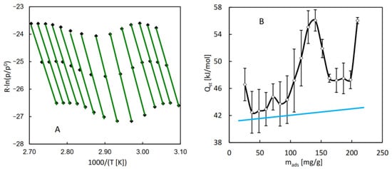For the purpose of the calculation of the isosteric heat of water adsorption in MIL-96, a series of QE-TPDA measurements was performed for different values of the H2O partial pressure in the carrier gas (Figure 4A). The integral desorption curves were calculated from the obtained thermodesorption profiles (Figure 4B). Based on these curves and the original QE-TPDA data, 17 isosteres (each consisting of three points) were constructed for the preset loadings in the range of 25–210 mg/g (Figure 5A). The dependence of the isosteric adsorption heat calculated from the slopes of the transformed isosteres on the loading is shown in Figure 5B. The values of adsorption heat are close to the condensation heat (41.4–43 kJ/mol in the relevant temperature range) and are noticeably lower than the low coverage adsorption heat (67 kJ/mol) obtained in molecular simulations [], corresponding to the Henry adsorption constant. This apparent discrepancy may be justified by the fact that the calculations of the isosteric adsorption heat were limited to the intermediate loading values. Actually, the adsorption heat found for the lowest loading analyzed (corresponding to the points at the end of the initial uptake range) is noticeably higher than the following values.