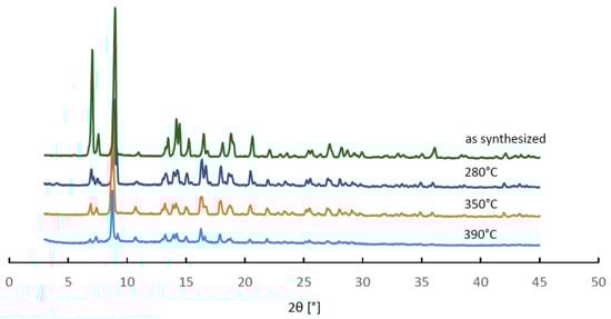 Powder XRD patterns of MIL-96 samples after the QE-TPDA hydrothermal stability tests interrupted at different temperatures compared with the pattern recorded for the as-synthesized sample.