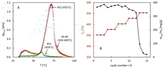 Results of the hydrothermal stability test for MIL-96: selected QE-TPD profiles corresponding to the last cycle in the 3-cycle sequences (A) and evolution of the hydrothermal treatment temperature and sorption capacity with the cycle number (B). Experimental details: heating rate β = 2 °C/min, inlet partial pressure of water pin = 2.8 kPa, sample mass m = 3.0 mg, carrier gas (N2) flowrate F = 8.0 cm3/min.