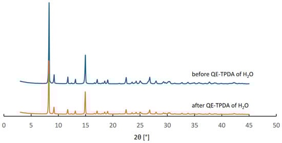 MIL-96 was synthesized according to the original method [] from an aluminum nitrate nonahydrate (>98%, Merck, Darmstadt, Germany) and trimesic (1,3,5-benzenetricarboxylic) acid (H3btc, 95%, Merck, Darmstadt, Germany). H3btc (2.1104 g) was placed into a 100 mL Teflon-lined steel autoclave, followed by the addition of 40 mL of deionized water under continuous stirring. Separately, Al(NO3)3·9H2O (18.7658 g) was dissolved in 30 mL of deionized water. The resulting solution was then combined with the H3btc solution and stirred vigorously for 10 min. The autoclave was subsequently sealed and heated to 210 °C for 24 h under autogenous pressure. After the reaction, the resulting solid product was isolated by filtration, thoroughly washed with deionized water, and left to dry in air at room temperature. The synthesis yield was 43%. CAU-10 was purchased from Strem Chemicals, Newburyport, USA. The PXRD patterns recorded for CAU-10 before and after the QE-TPDA measurements confirm structure and phase purity of this material, as well as its stability during in the thermodesorption experiments (Figure 10).
