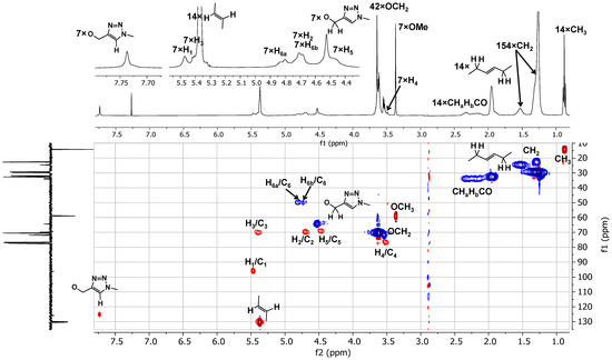To obtain the targeted per-2,3-O-elaidate-modified compounds 3/4, the mono-O-propargylated tetraethylene glycol derivatives 11 and 12 were synthesized as previously reported [30]. Each of these derivatives was then covalently linked to compound 10 via a copper (I)-catalyzed Huisgen [2+3] dipolar cycloaddition [27] in the presence of N,N-diisopropylethylamine (DIPEA) in acetone. The reaction was heated at 55 °C for approximately 96 h, and the desired amphiphilic β-CD derivatives (3–4) were successfully isolated. The copper catalyst was removed through multiple extractions with a 5% EDTA solution in water, followed by repeated precipitation–centrifugation in a mixture of dichloromethane and methanol. The final products were obtained in 56% and 97% yields. Structural characterizations of the final targets 3 and 4 were carried out using NMR experiments. As an example, Figure 2 shows the 1D 1H and 2D 1H-13C GHSQC correlation spectra of compound 3.