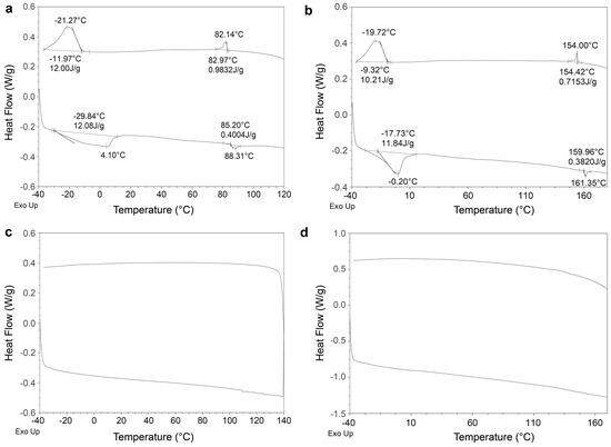 DSC thermograms of (a) 3, (b) 4, (c) 5, and (d) 6.