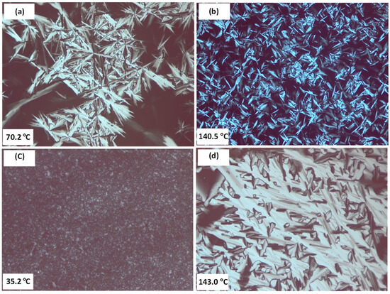 - Alamro, F.S.; Ahmed, H.A.; Bedowr, N.S.; Naoum, M.M.; Mostafa, A.M.; Al-Kadhi, N.S. New Liquid Crystals Based on Terminal Fatty Chains and Polymorphic Phase Formation from Their Mixtures. Crystals 2022, 12, 350. [Google Scholar] [CrossRef]