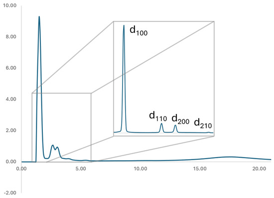Compound 4 exhibits more complex phase behavior. Upon heating, compound 4 exhibits two transitions in the DSC (Figure 3b), at −0.2 °C (79.7 kJ/mol) and 161.4 °C (2.6 kJ/mol); the latter transition was identified as the clearing temperature to the isotropic phase, which was confirmed by POM and XRD experiments. Upon cooling from the isotropic phase, the POM images show fluid fan-shaped textures typical of a columnar hexagonal (Colh) phase (Figure 4b and Figure S29). The X-ray diffractogram of this liquid crystal shows three low-angle peaks, indexed to the (100), (110), and (200) Miller planes of a Colh structure (Table 2). Both the POM textures and XRD patterns initially remain unchanged upon cooling to room temperature. However, samples left at room temperature for extended periods (days to weeks) gradually developed additional diffraction peaks, which index to a bicontinuous cubic phase (Cubbi, 1a3d space group) [40,41,42,43]. This is likely because the high viscosity of the Colh phase slows the transition to the Cubbi phase during cooling. As evidence, room-temperature POM images show a progressive decrease in birefringence (Figure 4 and Figure S29), consistent with a slow transformation from the Colh phase to an optically isotropic and more thermally stable Cubbi phase. Upon reheating, the Cubbi phase remains optically isotropic until ~65 °C, where a sudden increase in birefringence is observed (Figure 4 and Figure S29), and the POM textures gradually increase in brightness upon further heating (Figure 4 and Figure S29), indicating the reformation of the columnar phase, although no corresponding transition was detected by DSC. Finally, compound 4 completely clears into isotropic liquid phase at 160.3 °C (Figure 4 and Figure S29). This phase behavior, including the supercooling of the columnar phase, is reproducible across subsequent heating and cooling cycles. Similarly to compound 3, the transition at −0.2 °C to an unknown phase, which is denoted as X (Table 1), could not be directly examined by POM or XRD due to instrumental limitations.
