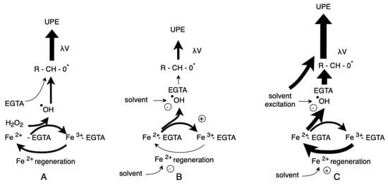 Plausible mechanisms through which organic solvents affect UPE in the Fe2⁺-EGTA-H2O2 System. (A) Without the addition of solvent. In this case, the •OH radicals generated by the Fe2⁺-EGTA-H2O2 system attack ether bonds in the EGTA structure leading to the formation of products containing triplet-excited carbonyl groups (R-CH-O*), which results in light emission (UPE—ultra-weak photon emission). Simultaneously, Fe2⁺ is regenerated according to the following chemical equations: Fe3+-EGTA + O2•- → Fe2+-EGTA + O2 (1); H2O2 + Fe3+-EGTA → HO2• + H+ + Fe2+- EGTA (2); and HO2• + Fe3+-EGTA → O2 + H+ + Fe2+-EGTA (3). This regenerated Fe2⁺ contributes to the further production of •OH radicals and UPE. (B) With the addition of an organic solvent that inhibits UPE in the Fe2⁺-EGTA-H2O2 system. The solvent directly scavenges •OH radicals, thereby protecting the ether bonds in EGTA and inhibiting the formation of triplet-excited carbonyl-containing products, which reduces light emission. Some solvents (e.g., ethanol) may also inhibit Fe2⁺ regeneration (Equation (1)), further suppressing UPE. (C) With the addition of an organic solvent that enhances UPE in the Fe2⁺-EGTA-H2O2 system. The solvent accelerates Fe2⁺ regeneration. In some cases, such as with acetone, the solvent itself may emit light due to excitation to a triplet state. However, these solvents can simultaneously scavenge •OH radicals; therefore, the enhancing effect is observed when the rate of •OH radical generation, driven by accelerated Fe2⁺ regeneration, exceeds the loss of radicals due to the solvent’s scavenging activity.