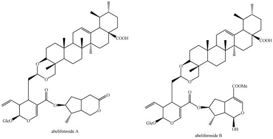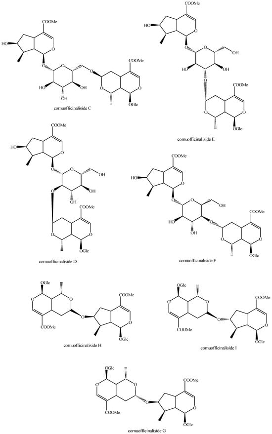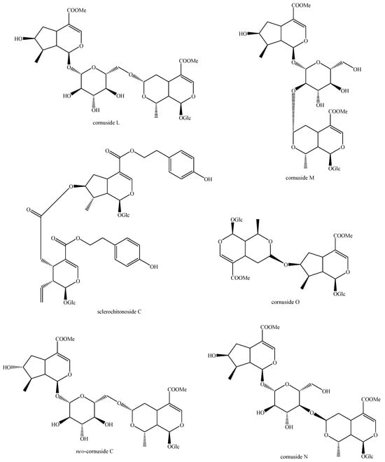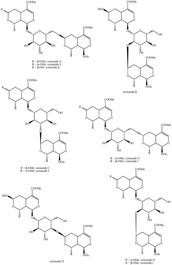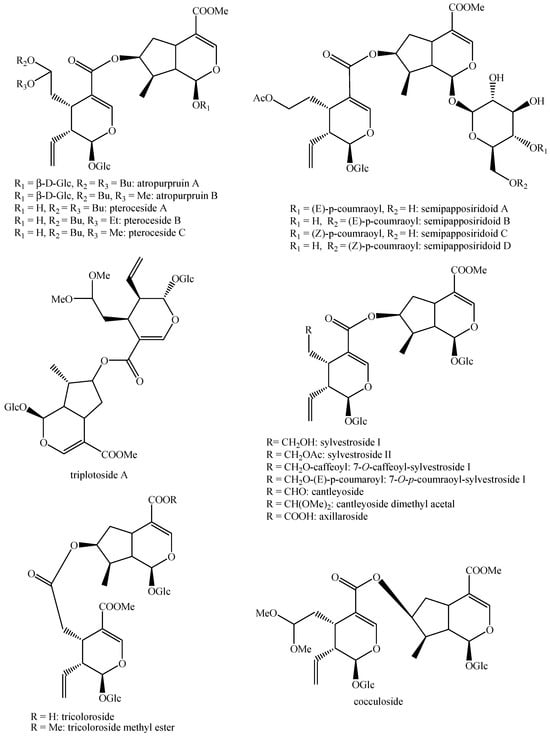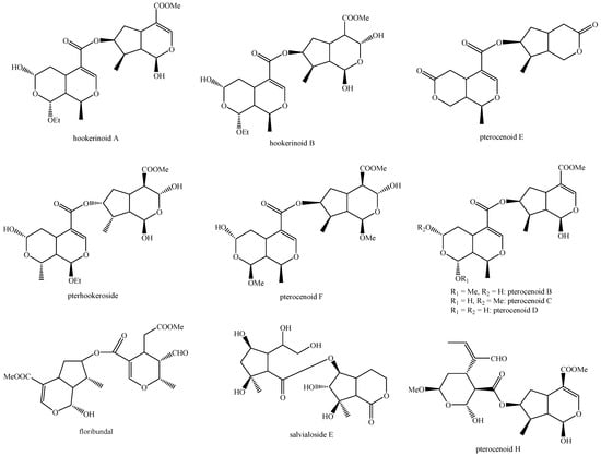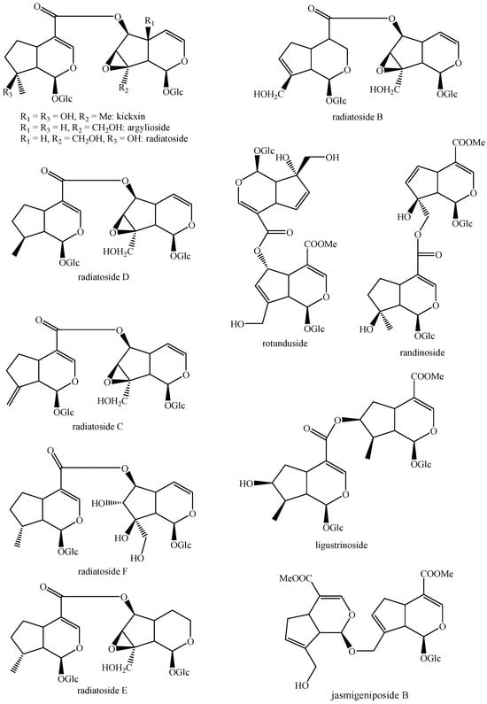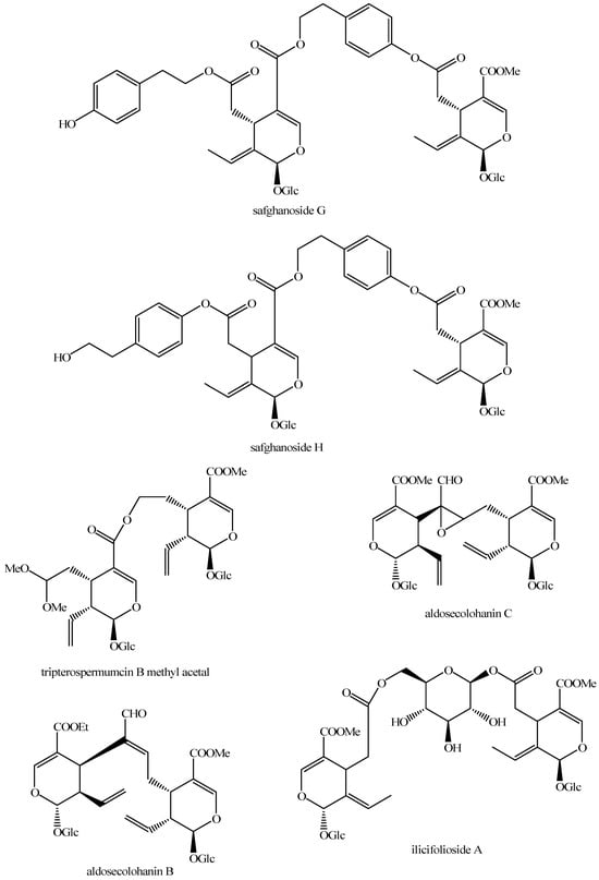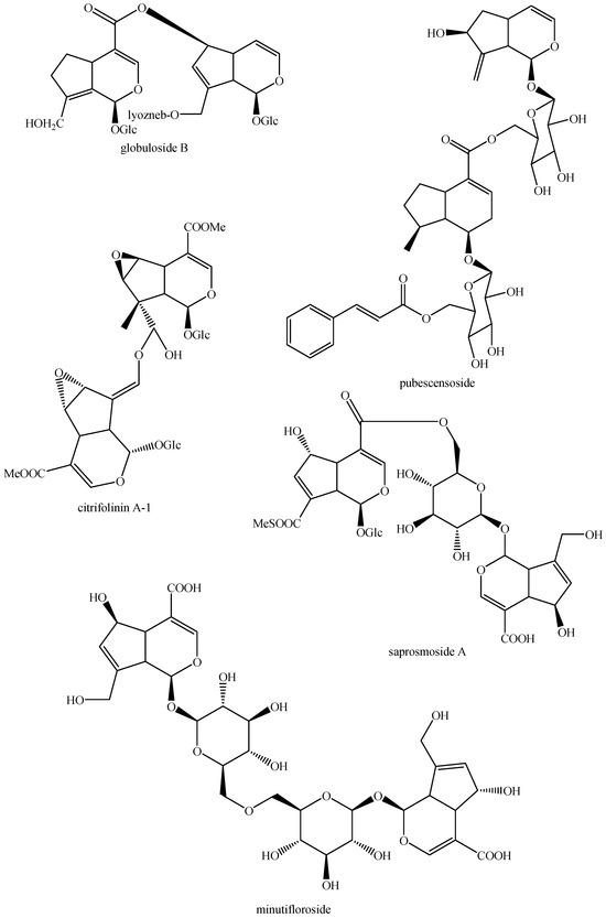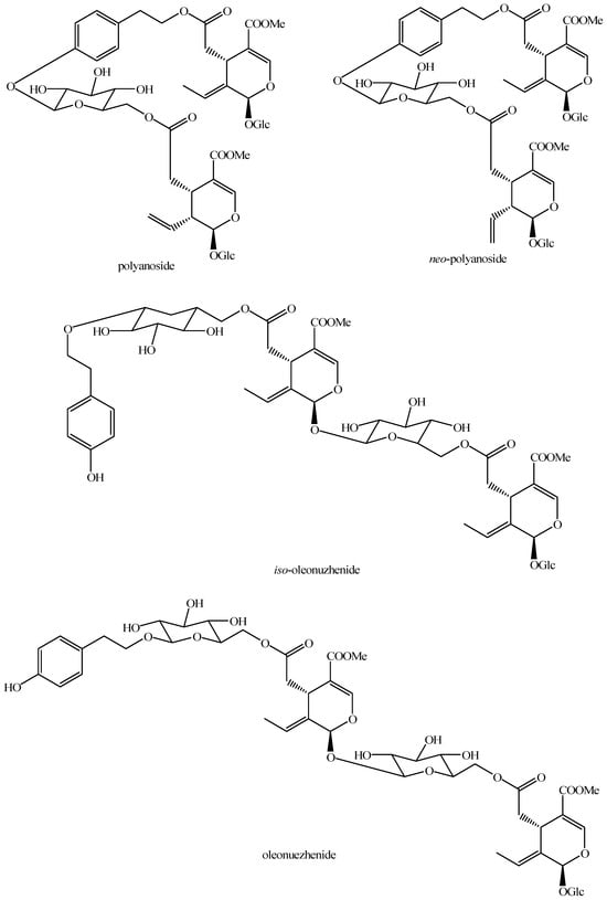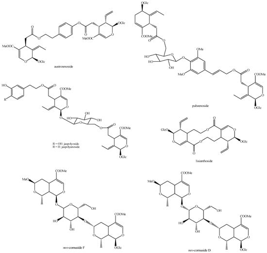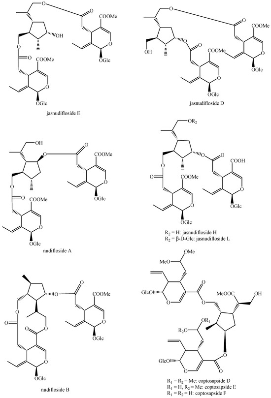 The dimer of alpinoside and alpinoside, the dimer of nuezhenide and 11-methyl-oleoside, the dimer of oleoside and 11-methyl-oleoside, demethyl-hydroxy-oleonuezhenide, demethyl-oleonuezhenide, hydroxy-oleonuezhenide and oleoneonuezhenide have not been fully characterized, and their structures have not been drawn. This may surely be an argument for future research. Additionally, the structures of premnaodoroside F and premnaodoroside G have not been drawn, since they are constituted by two isomers.