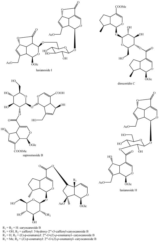 - Arnold, U.W.; Zidorn, C.; Ellmerer, E.P.; Stuppner, H. Iridoid and phenolic glycosides from Wulfenia carinthiaca. Z. Naturforsch. C 2002, 57, 969–975. [Google Scholar] [CrossRef] [PubMed][Green Version]