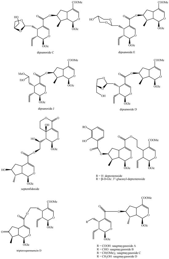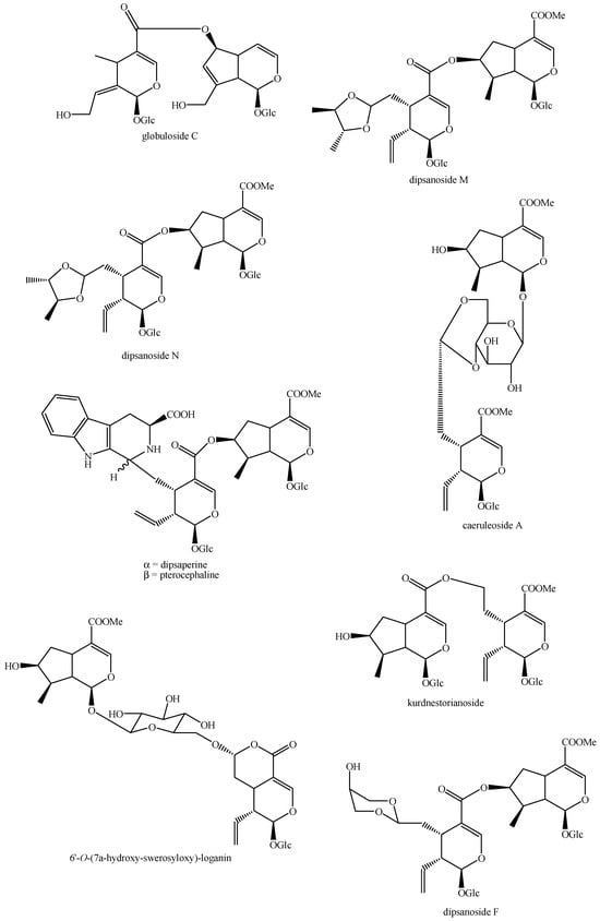 - Tomassini, L.; Foddai, S.; Nicoletti, M. Iridoids from Dipsacus ferox (Dipsacaceae). Biochem. Syst. Ecol. 2004, 32, 1083–1085. [Google Scholar] [CrossRef]