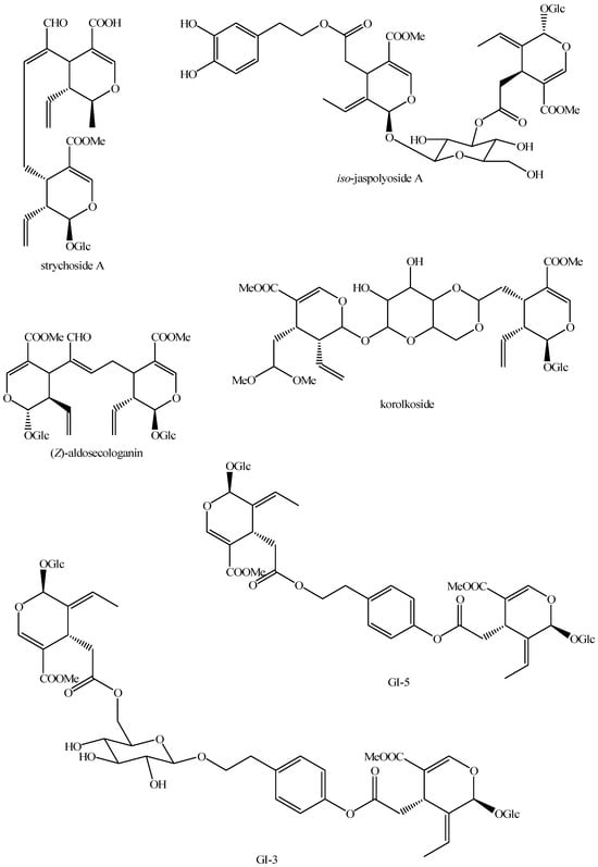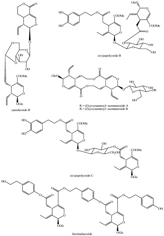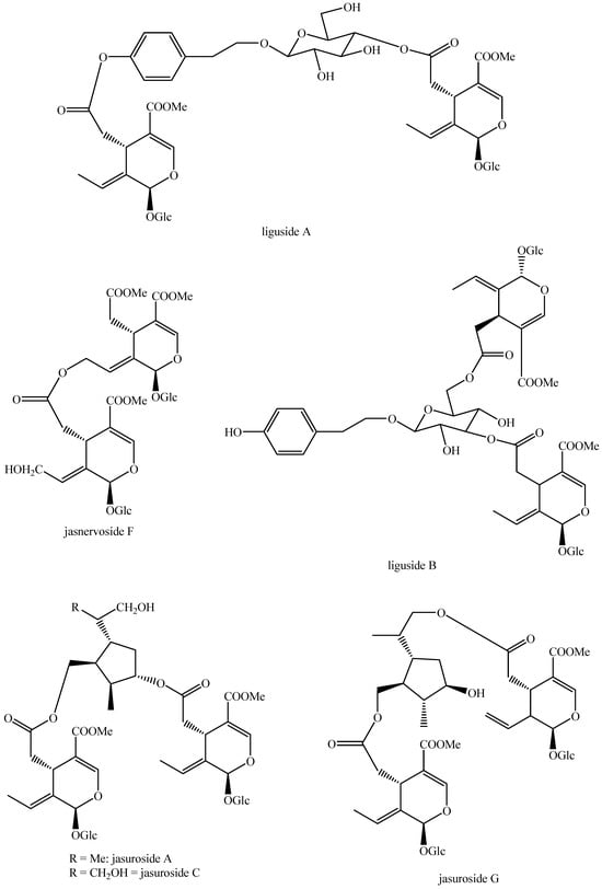 - Tanahashi, T.; Takenaka, Y.; Nagakura, N. Three secoiridoid glucosides esterified with a linear monoterpene unit and a dimeric secoiridoid glucoside from Jasminum polyanthum. J. Nat. Prod. 1997, 60, 514–518. [Google Scholar] [CrossRef]