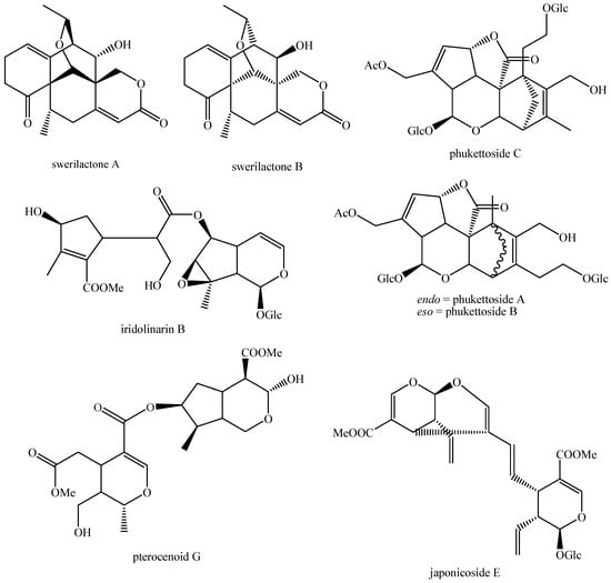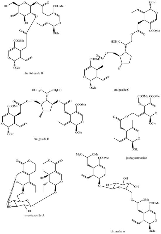 - Geng, C.-A.; Zhang, X.-M.; Ma, Y.-B.; Jiang, Z.-Y.; Liu, J.-F.; Zhou, J.; Chen, J.-J. Three new secoiridoid glycoside dimers from Swertia mileensis. J. Asian Nat. Prod. Res. 2010, 12, 542–548. [Google Scholar] [CrossRef] [PubMed]