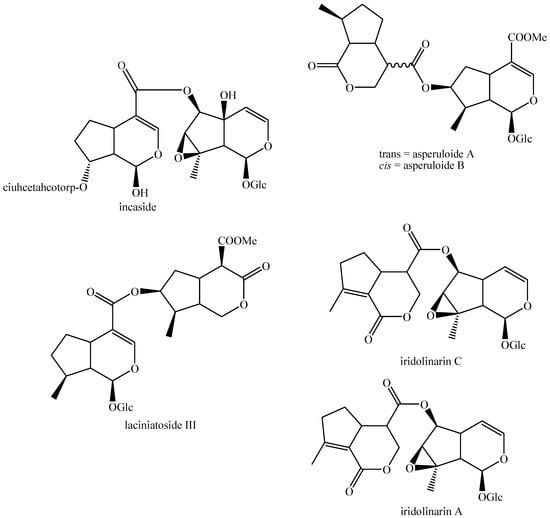 As Table 1 clearly displays, bis-iridoids have been found in many families: Apiaceae Lindl., Aquifoliaceae Bercht. & J.Presl, Bignoniaceae Juss., Calyceraceae R.Br. ex Rich., Caprifoliaceae Juss., Cornaceae Bercht. ex J.Presl, Gentianaceae Juss., Goodeniaceae R.Br., Lamiaceae Martinov, Loasaceae Juss., Loganiaceae R.Br. ex Mart., Oleaceae Hoffmanns. & Link, Orobanchaceae Vent., Plantaginaceae Juss., Rubiaceae Juss., Sarraceniaceae Dumort., Stemonuraceae Kårehed and Viburnaceae Raf. Their highest occurrence is in Rubiaceae, reported from fourteen different genera (Adina Salisb., Catunaregam Wolf, Coelospermum Blume, Coptosapelta Korth., Galium L., Gardenia J.Ellis, Gynochthodes Blume, Lasianthus Jack, Morinda L., Mussaenda Burm. ex L., Neonauclea Merr., Paederia L., Palicourea Aubl. and Saprosma Blume), whereas the lowest was in ten families, having been reported in one only genus each (Apiaceae: Heracleum L.; Aquifoliaceae: Ilex L.; Calyceraceae: Acicarpha Juss.; Cornaceae: Cornus L.; Cyperaceae: Cyperus L.; Goodeniaceae: Scaevola L.; Loganiaceae: Strychnos L.; Orobanchaceae: Pedicularis L.; Sarraceniaceae: Sarracenia Tourn. ex L.; Stemonuraceae: Cantleya Ridl.; Viburnaceae: Viburnum L.). Bis-iridoids have been reported in two Bignoniaceae genera (Argylia D.Don and Handroanthus Mattos), in twelve Caprifoliaceae genera (Abelia Gronov., Cephalaria Schrad., Dipsacus L., Linnaea Gronov., Lomelosia Raf., Lonicera L., Patrinia Juss., Pterocephalus Vaill. ex Adans., Scabiosa L., Triosteum L., Triplostegia Wall. ex DC. and Valeriana L.), in six Gentianaceae genera (Centaurium Hill, Fagraea Thunb., Gentiana Tourn. ex L., Gentianella Moench, Swertia L. and Tripterospermum Blume), in five Lamiaceae genera (Caryopteris Bunge, Clinopodium L., Leonotis (Pers.) R.Br. and Premna L., Salvia L.), in two Loasaceae genera (Kissenia R.Br. ex Endl. and Loasa Adans.); in seven Oleaceae genera (Fraxinus Tourn. ex L., Jasminum L., Ligustrum L., Olea L., Osmanthus Lour., Picconia DC. and Syringa L.) and in six Plantaginaceae genera (Anarrhinum Desf., Globularia Tourn. ex L., Kickxia Dumort., Linaria Mill., Picrorhiza Royle ex Benth. and Wulfenia Jacq.). This occurrence is not in perfect agreement with the one for simple iridoids [242]. In fact, several families (Acanthaceae Juss., Actinidiaceae Gilg & Werderm., Apocynaceae Juss., Asteraceae Giseke, Cardiopteridaceae Blume, Celastraceae R.Br., Centroplacaceae Doweld & Reveal, Columelliaceae D.Don, Cucurbitaceae Juss., Cyperaceae Juss., Daphniphyllaceae Müll.Arg., Ericaceae Juss., Escalloniaceae R.Br. ex Dumort., Eucommiaceae Engl., Fabaceae Juss., Euphorbiaceae Juss., Fouquieriaceae DC., Garryaceae Lindl., Gel-miaceae Struwe & V.A.Albert, Gri-liniaceae J.R.Forst. & G.Forst. ex A.Cunn., Hamamelidaceae R.Br, Hydrangeaceae Dumort., Icacinaceae Miers, Lentibulariaceae Rich., Malpighiaceae Juss., Malvaceae Juss., Martyniaceae Horan., Meliaceae Juss., Menyanthaceae Dumort., Metteniusaceae H.Karst. ex Schnizl., Montiniaceae Nakai, Nyssaceae Juss. ex Dumort., Passifloraceae Juss. ex Rous-l, Paulowniaceae Nakai, Pedaliaceae R.Br., Roridulaceae Martinov, Salicaceae Mirb., Sarraceniaceae Dumort., Scrophulariaceae Juss., Stilbaceae Kunth, Stylidiaceae R.Br. Symplocaceae Desf. and Verbenaceae J.St.-Hil.) are absent from Table 1, as well as a myriad of genera [242,243,244,245], and this clearly demonstrates that bis-iridoids must be separately considered from simple iridoids for biochemical, chemophenetic and pharmacological purposes and that their biosynthesis is only due to genetic factors and not to a combination of genetic and environmental factors.