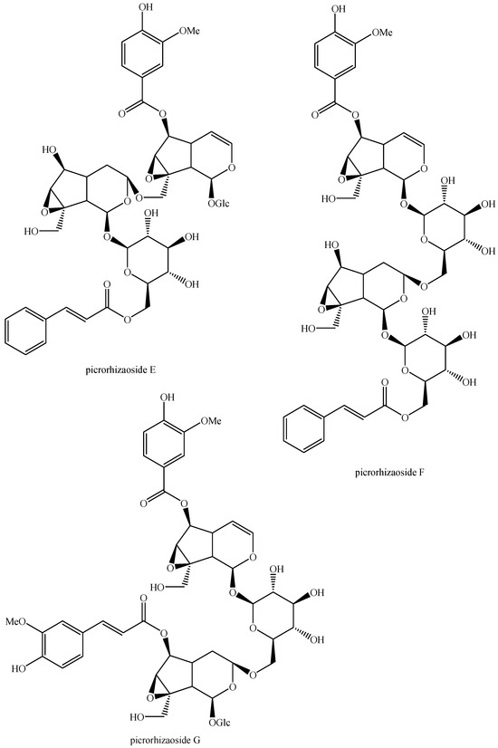 - Morikawa, T.; Nakanishi, Y.; Inoue, N.; Manse, Y.; Matsuura, H.; Hamasaki, S.; Yoshikawa, M.; Muraoka, O.; Ninomiya, K. Acylated iridoid glycosides with hyaluronidase inhibitory activity from the rhizomes of Picrorhiza kurroa Royle ex Benth. Phytochemistry 2020, 169, 112185. [Google Scholar] [CrossRef]