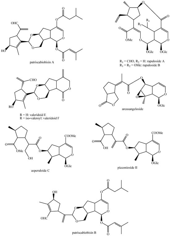 - Liu, Z.; Niu, Y.; Zhou, L.; Meng, L.; Chen, S.; Wang, M.; Hu, J.; Kang, W. Nine unique iridoids and iridoid glycosides from Patrinia scabiosaefolia. Front. Chem. 2021, 9, 657028. [Google Scholar] [CrossRef]