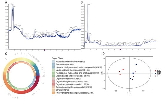 Metabolomics analysis of Pu-erh tea with different fermentation methods. (A) Positive ion pattern of total ion flow map of sample. (B) Negative ion pattern of total ion flow map of sample. (C) Metabolite classification map. (D) PCA.