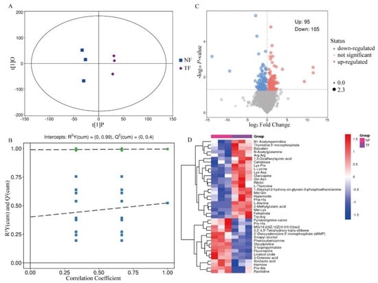 Although the principal component analysis method can effectively extract the main information, it is not sensitive to the variables with small correlation. To screen the differently expressed metabolites (DEM) of Pu-erh tea with different fermentation methods, OPLS-DA analysis was performed with all the relevant metabolites as variables. The results showed that both NF and TF were located within the confidence intervals and were clearly differentiated, and the R2Y and Q2 values of the model were high, with a high degree of model explanation, and were stable and reliable (Figure 2A,B), suggesting that there were significant differences between NF and TF metabolites. Screening their DEMs according to VIP > 1.00 and p < 0.05 revealed a total of 200 DEMs for NF and TF, 95 metabolites were up-regulated and 105 metabolites were down-regulated (Figure 2C), of which amino acid and fatty acid analogs were more different in the two groups of samples, and amino acid analogs were significantly increased in the samples fermented by Aspergillus niger (Table S2) (Figure 2D).