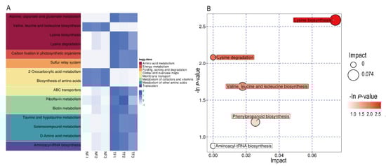 All the differential metabolites were matched with the KEGG database to obtain the pathway information of the metabolites, and a total of 24 metabolic pathways were annotated. The heat map analysis of the obtained metabolic pathways revealed that 7 of the top 15 metabolic pathways were directly related to amino acid metabolism (Figure 3A). Enrichment analysis was performed on the annotated metabolites, and the top five metabolic pathways enriched with more differential metabolites were shown in bubble plots (Figure 3B). It was found that the top five KEGG pathways that were the most important in the NF vs. TF group when combined with enrichment and topology analyses were as follows: lysine biosynthesis, lysine degradation, valine, leucine and isoleucine biosynthesis, phenylpropanoid biosynthesis, and aminoacyl-tRNA biosynthesis. The amino acid metabolic pathways were highly enriched by the addition of Aspergillus niger on tea fermentation, which is consistent with the results of the differential metabolite analysis within the NF and TF groups.