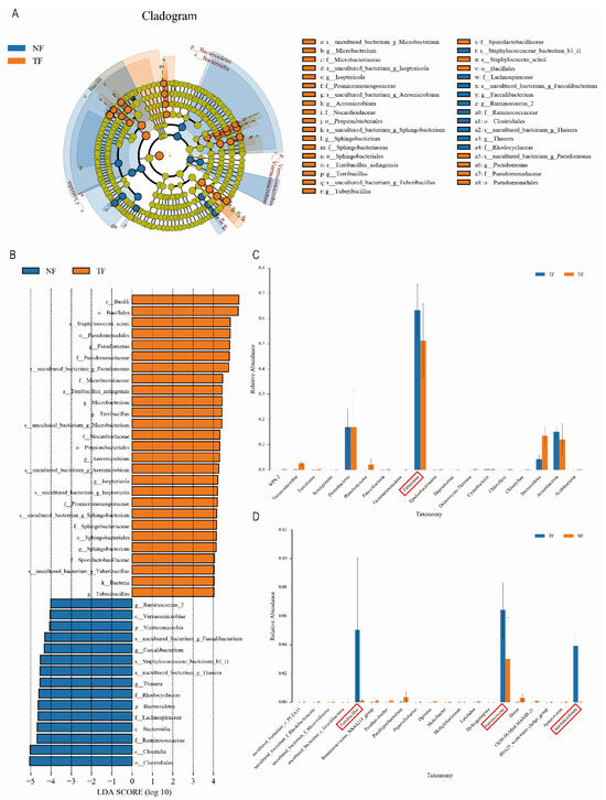 Biomarkers in the microbial community were identified by using LEfSe analysis combined with LDA with p < 0.05 and LDA > 4 as screening criteria, and the results showed that there was a significant difference in the bacteria in the tea samples after the enhanced fermentation of Aspergillus niger (Figure 5A,B), whereas the composition of the fungal community in the TF and the NF, consisting of Ascomycota and Mucoromycota, did not show a significant difference. Bacilli, Staphylococcus-sciuri, Pseudomonadales, and Microbacteriaceae were the most abundant bacterial species in TF, whereas in NF, Clostridia, Ruminococcaceae, Bacteroidia, and Verrucomicrobiae were significantly enriched. Notably, the abundance of Firmicutes significantly increased during fermentation in the TF group (Figure 5C), far surpassing the growth of other microbial communities. Further analysis of the bacterial composition at the genus level revealed that the TF group exhibited high abundances of Terribacillus, Enterococcus, and Aeromicrobium (Figure 5D). Typically, these microbial biomarkers can reflect differences between various fermentation methods and the resulting tea products.