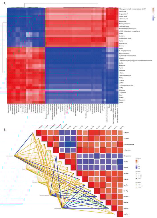 Based on the correlation analysis between differential metabolites and differential microorganisms (Figure 6A), a total of 2067 pairs of genus–metabolite relationships were analyzed between differential metabolites and differential microorganisms in Aspergillus niger and naturally fermented Pu-erh teas, of which 581 pairs had significant correlation with p < 0.05, of which 253 pairs of colony–metabolites were found to be positively significantly correlated with the DEM, and 328 pairs of colony–metabolites were negatively significantly correlated with the DEM. Aeromicrobium and Isoptericola were both significantly different from 31 kinds of DEM, most of the differential microorganisms showed significant positive correlation with the DEM, and the metabolite Met-Lys was highly different from most of the differential microorganisms in the correlation analysis. Combined with the microbial community difference analysis, the Mantel test correlation heat map analysis of the best combination of content and significance of difference at the level of phylum, class, order, family, and genus with the flavor substances of DEM revealed that (Figure 6B) the flavor substances of Bacillales in Bacilli and Pseudomonas in Pseudomonadaceae were significantly correlated with the flavor substances of Pu-erh tea after the enhanced fermentation of Aspergillus niger. Specifically, Bacillales exhibits an extremely significant correlation with Met-Lys (p < 0.01), indicating its key role in protein degradation and dipeptide formation, which directly affects the umami taste and basic flavor of the tea. Pseudomonas, on the other hand, is significantly correlated with Glycylproline, Lys-Pro, Trp-Arg, Gln-Asn, Met-Gln, and Met-Lys (p < 0.05), highlighting its crucial role in the generation of aromatic compounds thereby enhancing the aroma levels and complexity of the tea. Collectively, this suggests that the metabolic interactions between Bacillales and Pseudomonas during the Aspergillus niger process enhanced the fermentation process jointly to determine the significant changes in the flavor profile of Pu-erh tea.