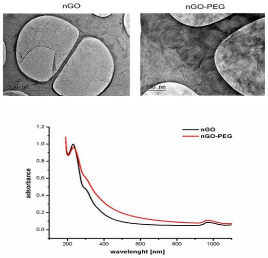 We further measured the UV-Vis spectra of the nGO and nGO-PEG NPs (Figure 1 right) to investigate the NPs’ absorbance in the range of 190–1100 nm, covering the UV-Vis-NIR region of the electromagnetic spectrum.