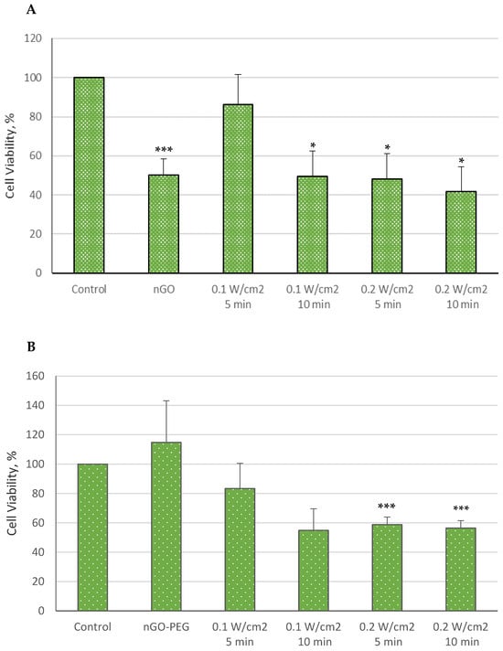 Cell viability of HepG2 cells treated with nGO (A) and nGO-PEG NPs (B) with a concentration of 100 μg/mL, irradiated with a laser beam at 515 nm for 5 and 10 min and with power densities of 0.1 and 0.2 W/cm2. The results’ statistical significance was denoted as * p < 0.05; *** p < 0.005.