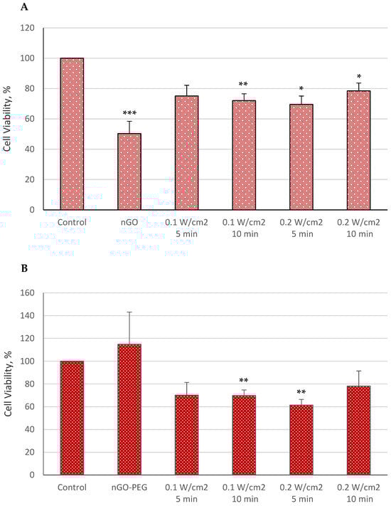 Cell viability of HepG2 cells treated with nGO (A) and nGO-PEG NPs (B) with a concentration of 100 μg/mL, irradiated with a laser beam at 1030 nm for 5 and 10 min and with power densities of 0.1 and 0.2 W/cm2. The results’ statistical significance was denoted as * p < 0.05, ** p < 0.01, and *** p < 0.005.