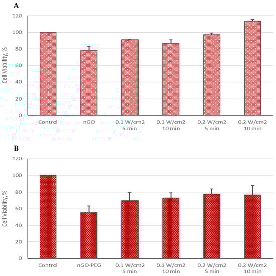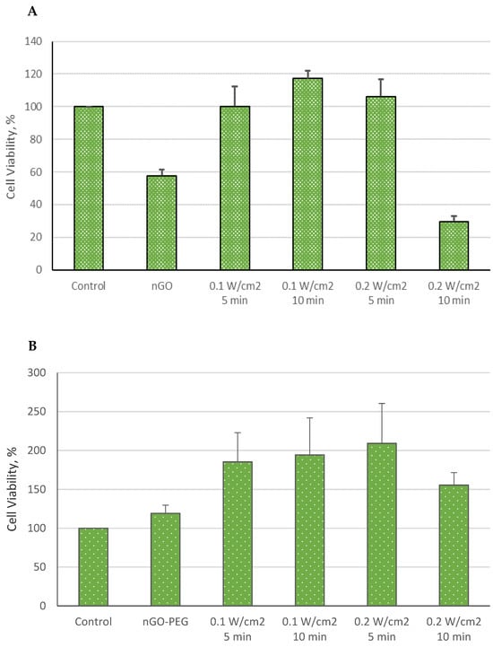 Cell viability of MDCK cells treated with nGO (A) and nGO-PEG NPs (B) with a concentration of 100 μg/mL, irradiated with a laser beam at 1030 nm for 5 and 10 min and with power densities of 0.1 and 0.2 W/cm2.