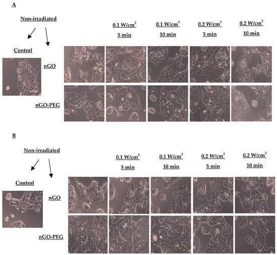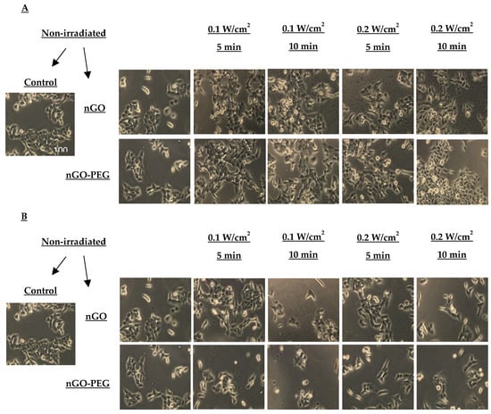 Morphological changes in the MDCK cell line treated with nGO and nGO-PEG NPs with a concentration of 100 μg/mL a day after irradiation with a laser beam at 515 nm (A) and 1030 nm (B) for 5 and 10 min and with power densities of 0.1 and 0.2 W/cm2.