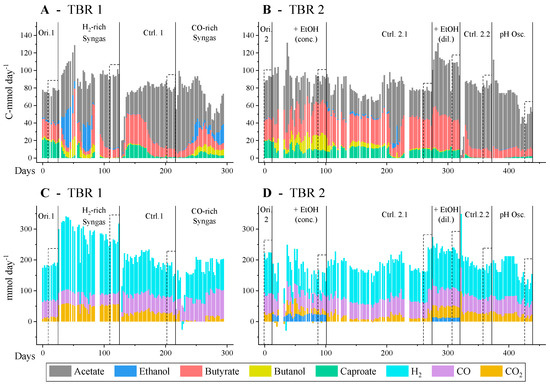 The two TBR (TBR1 and TBR2) were run continuously for 300 and 450 days, respectively; the profiles of CO, H2, and CO2 consumption and product generation are shown in Figure 1. Regardless of the changes on the consumption and production profile during the transition periods before the steady-states were reached, the reactor’s performance was evaluated solely based on steady-state operation. The changes happening during transition periods could be due to possible disruptions of the normal operation of the reactors. At the original conditions, the reactors produced a mixture of carboxylic acids from syngas, namely acetic acid (46 ± 2% of the C-mol in the products), butyric acid (26 ± 1%), and caproic acid (23 ± 1%). On average, 121, 59, and 20 mmol day−1 of H2, CO, and CO2, respectively, were consumed in this period. This means 64% of the H2 and 70% of the CO fed were consumed, while only 19% of the CO2 was converted. The measured CO2 conversion depends on both the production (through CO fermentation) and consumption of CO2. Nevertheless, the fact that the overall CO2 conversion was low at the original conditions can be easily explained by the relationship between carbon moles and electron moles present in the substrates and in the products. At these conditions, the syngas mix fed presented an electron mol to carbon mol ratio (e:C ratio) of 2.9. On the other hand, the e:C of the carboxylic acids present is 4 for acetic acid, 5 for butyric acid, and 5.3 for caproic acid. Thus, the research question raised was whether supplementation with additional electron donors would improve the consumption rates of syngas, as it could enable the conversion of more CO2 into ethanol and acetic acid in the acetogenic step. Moreover, whether a more reducing substrate could increase the ethanol:acetic acid ratio reaching the chain elongation step, thus improving the yield of chain-elongated acids.