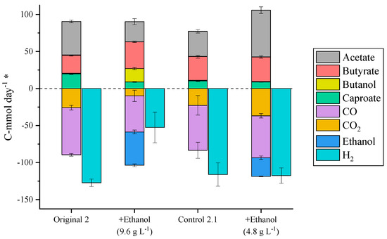 Subsequently, the reactor was set back to control conditions. After a baseline steady-state was obtained, ethanol supplementation was tested at a concentration of 4.8 g L−1, to decrease the ethanol concentration inside the reactor and prevent butanol formation. In this case, 97% of the ethanol fed was converted to products. In contrast to the 9.6 g L−1 ethanol supplementation experiment, the consumption of H2 and CO remained at similar levels, while the CO2 consumption increased by 62% (Figure 3). Furthermore, acetic acid production increased, and butyric and caproic acid production remained constant. Taking into account the chain elongation stoichiometries (see Section 3.3), around 13.5 mmol day−1 ethanol were necessary in control 2.1 and in the 4.8 g L−1 supplementation experiment to produce the butyric and caproic acid present. In control 2.1, this ethanol was produced by acetogenic bacteria, while during the 4.8 g L−1 supplementation experiment, 12.6 mmol day−1 of ethanol was consumed from the ethanol provided exogenously and, therefore, only 0.9 mmol day−1 ethanol was produced by acetogenic bacteria. This implies that the addition of exogenous ethanol diverged the acetogenic metabolism towards the production of acetic acid and supports the assumption that exogenous ethanol addition hinders endogenous ethanol generation. Additionally, the change in the acetogenic production profile did not affect the consumption of electron donors (H2 and CO), which remained constant, but resulted in higher CO2 consumption rates as acetic acid production requires less electron equivalents per carbon consumed than ethanol production.